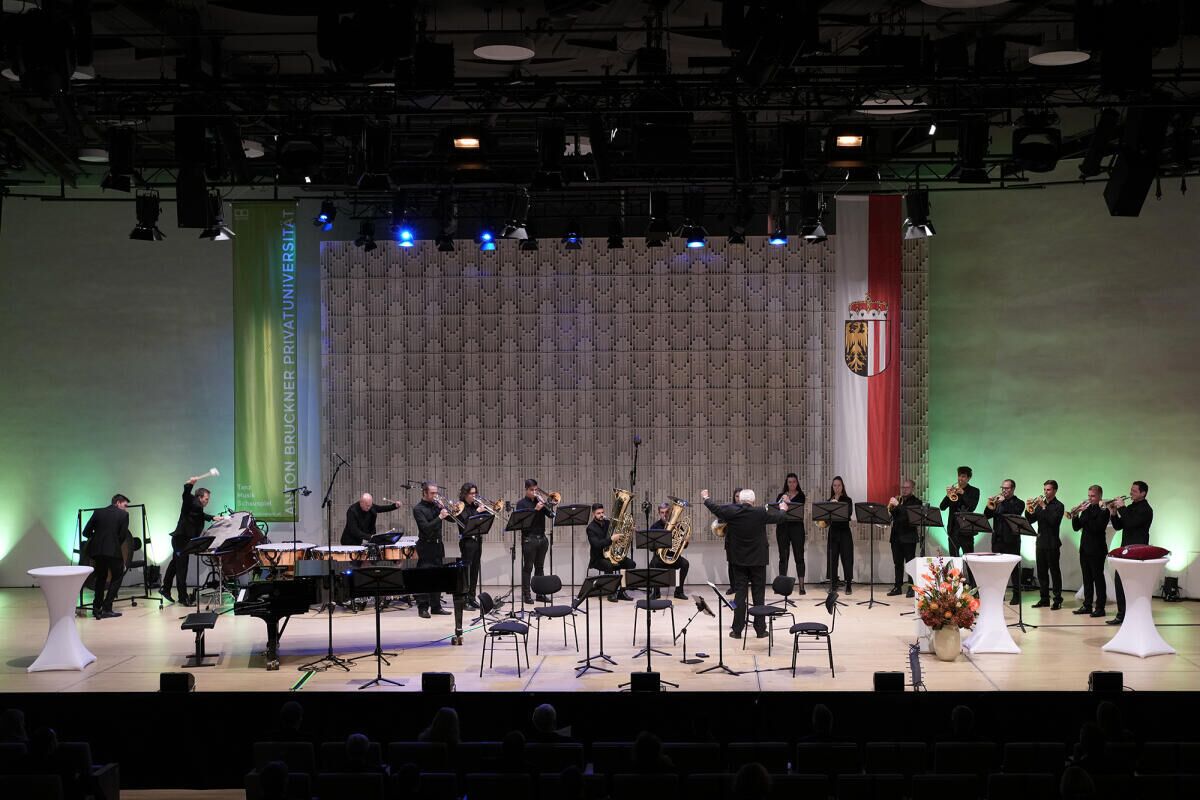 Bei der Inauguration durfte natürlich auch die Musik nicht zu kurz kommen: Tosend eröffnet wurden die Feierlichkeiten mit der „Fanfare for the Common Man“ von Aaron Copland, dargeboten von Studierenden des Instituts für Blechblasinstrumente und Schlagwerk unter der Leitung von Josef Eidenberger. Andrea Santiago Carrillo (Violine) und Elena Nemtsova (Klavier) brachten drei Romanzen für Violine und Klavier (op.22) von Clara Schumann zu Gehör. Carrillo spielte dabei auf einer Violine von Geigenbauer Giovanni Battista Guadagnini von 1750. Das wertvolle Instrument war eine Schenkung an die Bruckneruni im Jahr 2021 und wird künftig jedes Studienjahr nach einem Auswahlverfahren einem anderen Studierenden zur Verfügung gestellt.