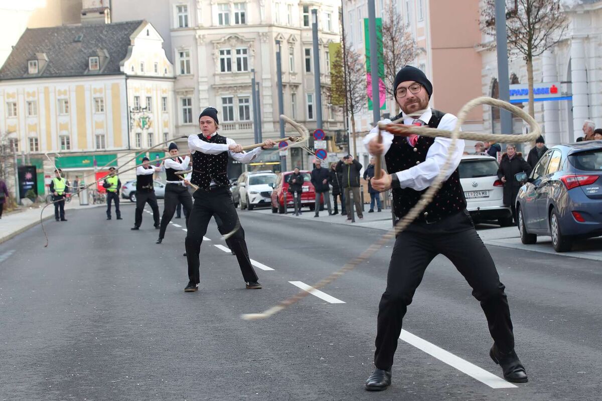 Aperschnalzen 2022: Das neue Jahr wurde vor dem Linzer Landhaus bereits kräftig eingepeitscht