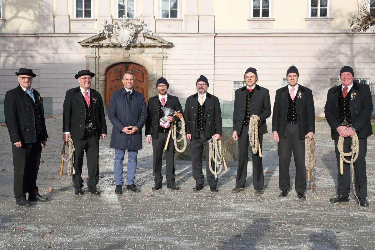 LINZ. Jährlich findet vor dem Linzer Landhaus das große Aperschnalzen zum Einpeitschen des neuen Jahres statt. Heuer richtete der Trachtenverein Altstädter Bauerngmoa in einer kleineren Formation seinen Neujahrsgruß an Landesrat Wolfgang Hattmannsdorfer in Vertretung von Landeshauptmann Thomas Stelzer.