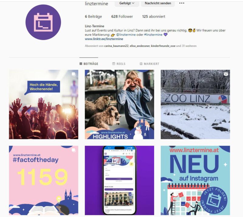 Jahr für Jahr finden in Linz zigtausende kleinere und größere Events und Ausstellungen statt. Damit auch Jugendliche und junge Erwachsene davon Wind bekommen, wird der Instagram-Kanal „Linz-Termine“ (www.instagram.com/linztermine) zum Leben erweckt. Gemeinsam mit dem Facebook-Auftritt können so alle Zielgruppen optimal erreicht werden.