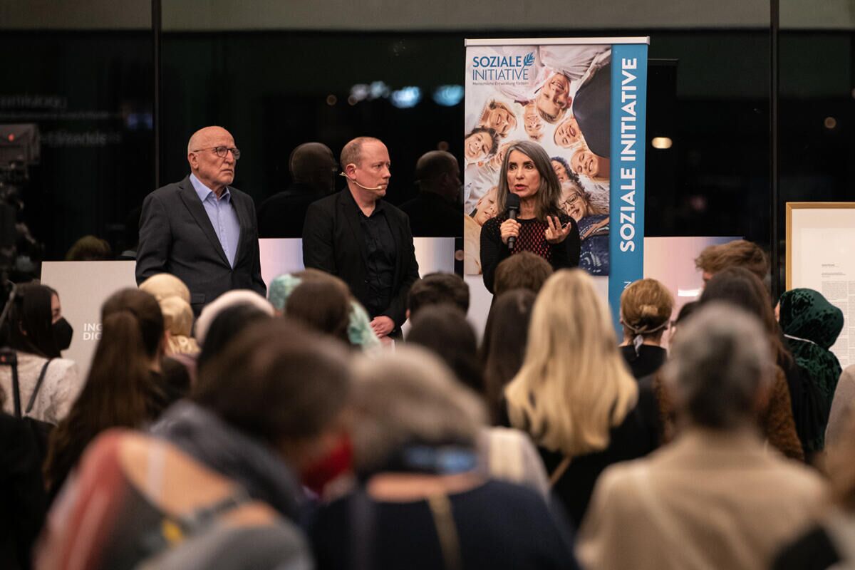 Wer bei der Eröffnung im Lentos den Geschichten der tschetschenischen Jugendlichen lauschte, gelesen von bekannten österreichischen Kunstschaffenden, stellte fest, dass sich diese jungen Menschen von allen anderen in Österreich kaum unterscheiden. „Wenn man diese Texte liest wird sichtbar, dass ein tschetschenischer Bauer genauso ist wie ein österreichischer und dass seine Frau zu ihm auch genauso ist wie die Frau des hiesigen“, sagt Gerhard Ruiss, Schriftsteller und Musiker, Geschäftsführer der IG Autorinnen Autoren, der Malika seine Stimme geliehen hat. Ruiss war einer der prominenten Leser, der gemeinsam mit Karikaturist Gerhard Haderer, Journalistin und Autorin Mathilde Schwabeneder, Kunstaktivistin Andrea Hummer, Schriftsteller und Slam-Poet René Bauer, Chordirigentin des Landestheaters Linz Elena Pierini, Musiker Philipp Kroll der Band Texta, Künstlerin Claudia Hochedlinger, Stimm*Raum-Projektleiterin Sabine Kerschbaum von der Soziale Initiative sowie Katharina Fernandez-Metztbauer von der Integrationsstelle des Landes. Moderiert wurde der Abend vor rund 200 Besuchern von Satiriker und Kabarettist Klaus Oppitz.