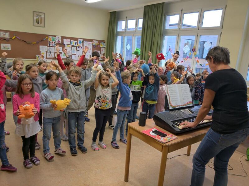 Insgesamt siebenmal ist die Chorleiterin im Laufe des Schuljahres an der Karlhofschule, um je einen Vormittag lang mit allen Kindern zu singen und zu tanzen. Im Mai findet ein großes Abschlusskonzert auch vor den Eltern der Karlhof-Volksschule statt. Doch bei den Monsterfreunden geht es noch um viel mehr, wie Direktorin Daniela Bachmann weiß: „Durch Corona wurde auch das Singen an der Schule komplett zurückgedrängt, nun können wir endlich wieder mit den Kindern gemeinsam musizieren und singen. Die Geschichten und Motive aus den Songs werden auch in anderen Schulfächern von den Lehrern im Unterricht eingebunden und verknüpft. Hier tun sich unsere Lehrer auch viel Arbeit an. Der Musikunterricht strahlt so in alle Fächer. Die Kinder sind davon sehr begeistert.“