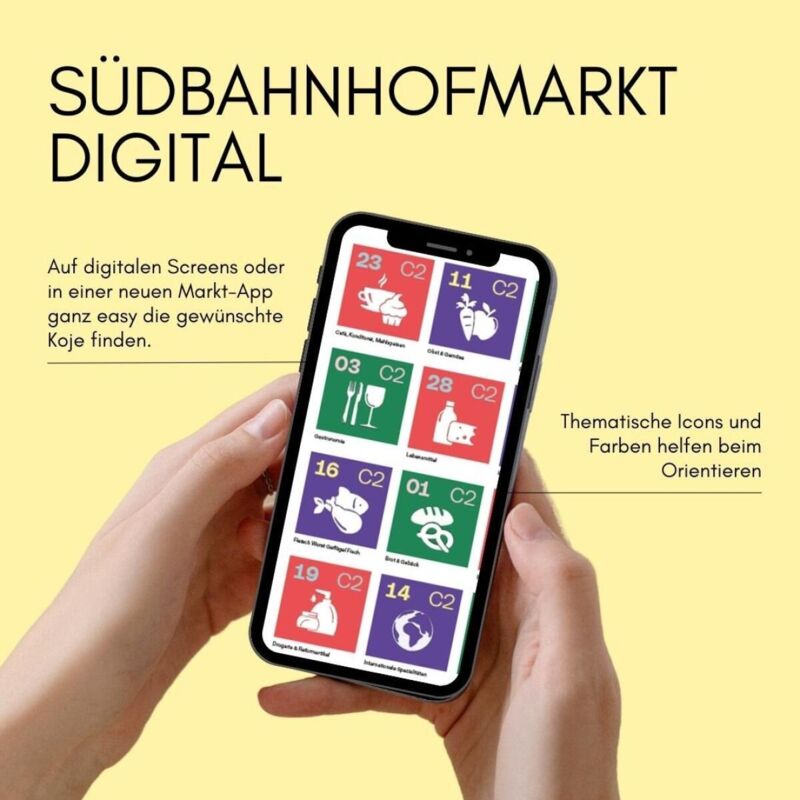 Es gibt auch drei farblich gegliederte Zonen zur leichteren Orientierung. Der erste Schritt war die analoge Beschilderung der Kojen zur Orientierung, die sich dann auch in der App farblich und symbolisch wiederspiegelt. Ziel ist es somit auch neue und jüngere Zielgruppen für den Südbahnhofmarkt zu gewinnen. Gerade jüngere Zielgruppen sind es gewohnt, sich über andere Wege zu orientieren und zu informieren.