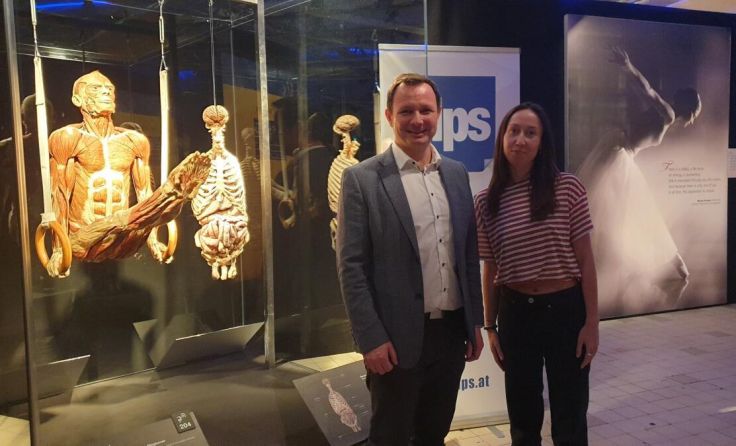 Davon selbst überzeugen konnten sich die Gäste beim Tips-Empfang zur Ausstellung. Vor dem Besuch der Körperwelten in der Lösehalle wurde im Tabakfabrik-Foyer zu kleinen Köstlichkeiten und Getränken von Good Karma Gastro geladen. Tips-Geschäftsführer Moritz Walcherberger und die Ausstellungsleiterin der Körperwelten in Linz Lisa Prasch begrüßten die Gäste.