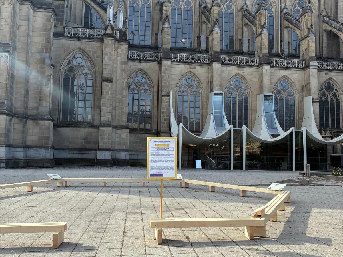 Im Zentrum steht das Symbol des Zelts. Mehrere Holzbänke bilden am Domplatz dessen Grundriss. Darauf sind Tafeln mit Fotos und Zitaten von Menschen angebracht, die als „Baumeister:innen der Gesellschaft“ vorgestellt werden. Über QR-Codes gelangen Besucher zu Videobotschaften, in denen Architekten, Planer und Gemeindebauer ihre Gedanken zu Zelt und Bauen teilen.