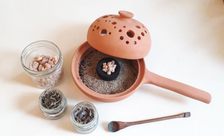 Für eine Räucherung braucht es ein feuerfestes Gefäß, Sand, Räucherzange, Räucherkohle und die gewünschten Kräuter. Die Kohle wird entzündet, auf den Sand gelegt und anschließend mit den Pflanzen bestreut. Wichtig ist, danach gut zu lüften.