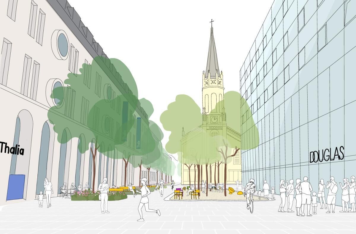Geplant sind zwölf Pflanzbeete mit schattenspendenden Ulmen, neue Sitzelemente und ein barrierefreier Trinkbrunnen.
