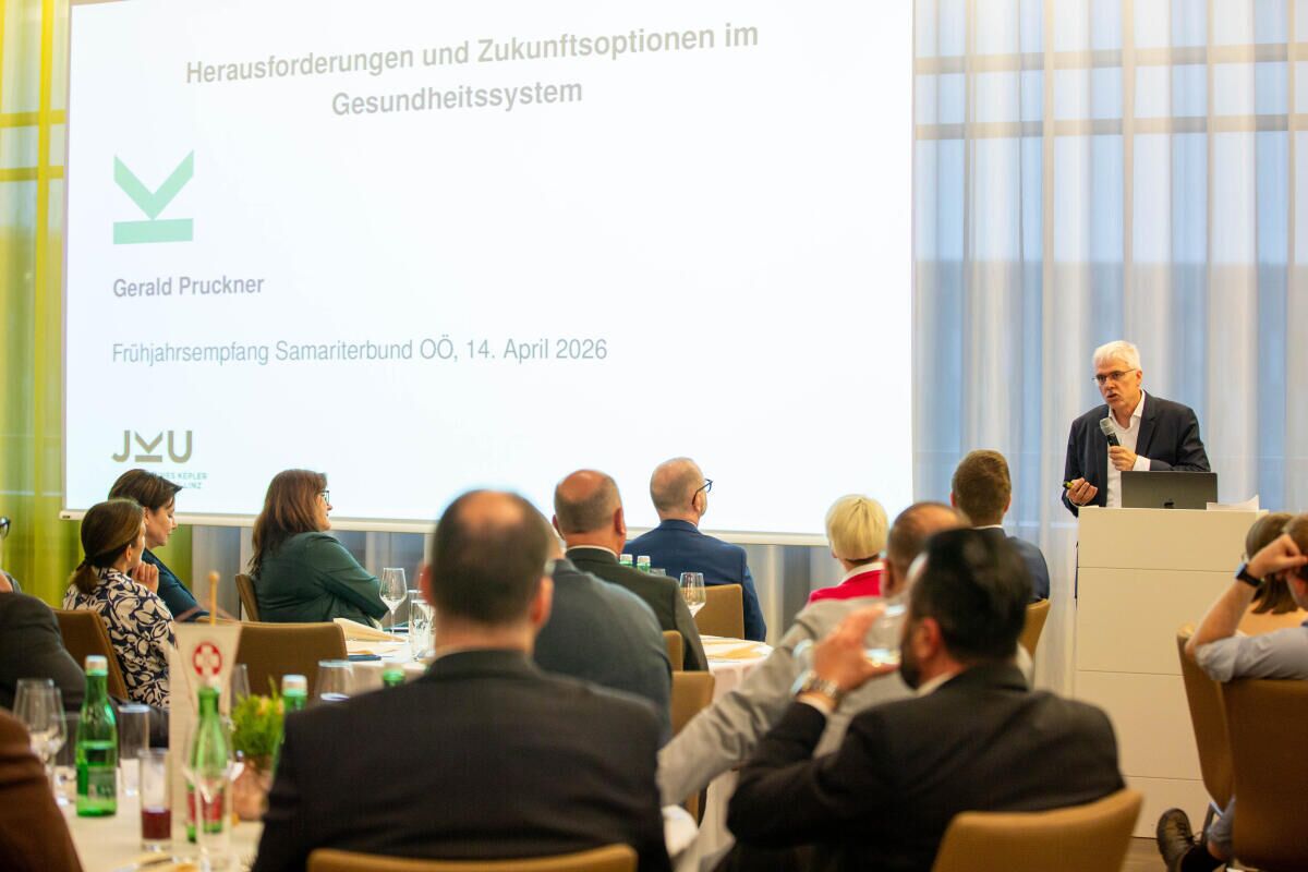 Einen Vortrag zum Thema „Herausforderung und Zukunftsoptionen im Gesundheitssystem“ präsentierte im Anschluss Gesundheitsökonom Gerald Pruckner von der Johannes Kepler Universität Linz. In anschaulicher Weise ging er auf die Vielschichtigkeit und Komplexität der Entwicklungen im Gesundheitssystem ein. Darüber diskutierten in der folgenden Expertenrunde auch noch Samariterbund Landeschefarzt Wolfgang Mottl, der Vorsitzende des Landesstellenausschusses der ÖGK OÖ Albert Maringer und der ärztliche Leiter des Ordensklinikum Stefan Beyerlein gemeinsam mit Gerald Pruckner und Landesvizepräsident Wolfgang Steiner.