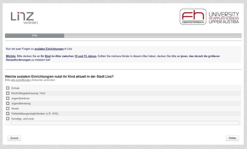 Inhaltlich fokussiert der Fragebogen die Anliegen und Herausforderungen junger Menschen, wie Eltern damit umgehen und welche Unterstützungsleistungen in Anspruch genommen werden. “Ich hoffe, dass zahlreiche Linzer Eltern den Fragebogen ausfüllen und damit ein Stück zur Entstehung des Linzer Sozialprogramms beitragen. Zudem ist damit den Studierenden geholfen, die trotz dieser außergewöhnlichen Situation die Befragung durchführen können“, so Hörzing.