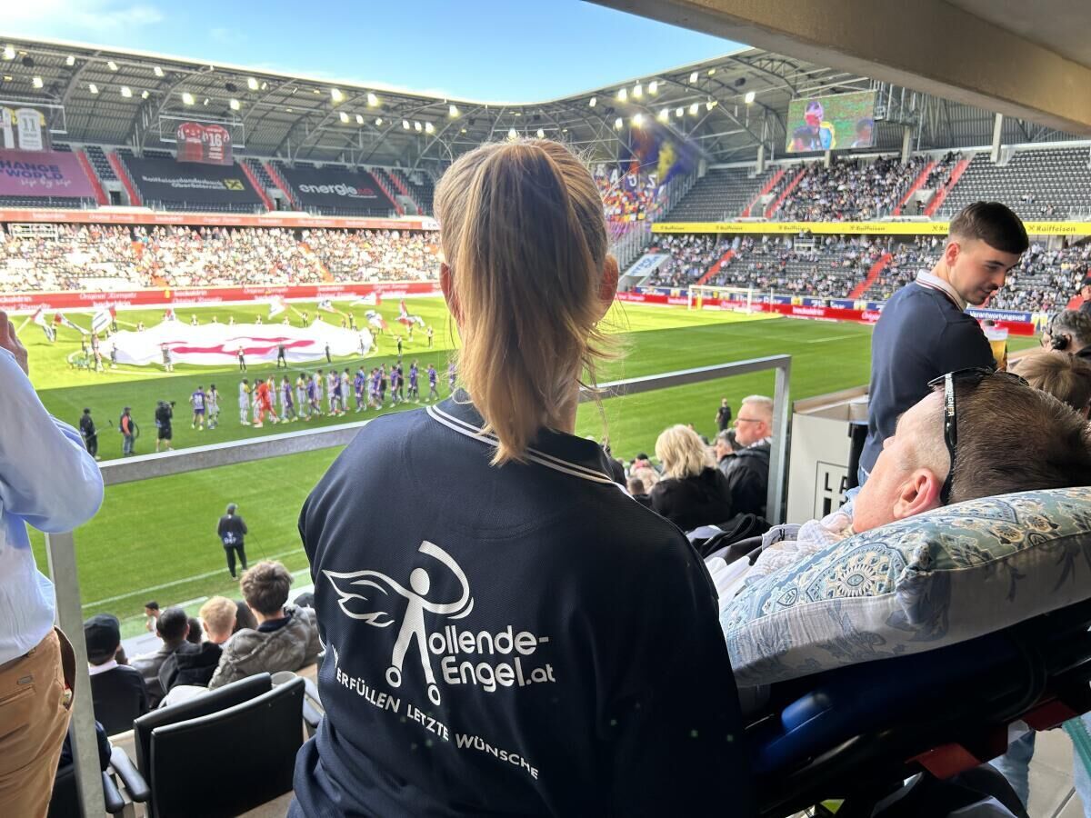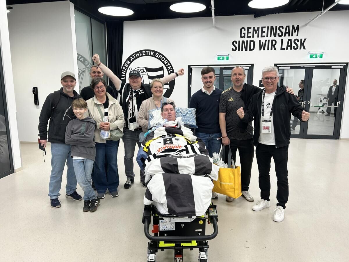 Sein größter Wunsch war es, noch einmal ins Stadion zu kommen, das für ihn all die Jahre sein zweites Zuhause war. Die ehrenamtlichen Wunscherfüller des Vereins Rollende Engel holten Markus am Ostersonntag zu Hause ab. Zu seiner Überraschung war seine Fahrtrage, in schwarz-weißer Bettwäsche liebevoll vorbereitet und auch das Fahrzeug war mit Fanartikeln geschmückt. Dem LASK-Anhänger liefen Tränen über die Wangen, Tränen der Freude und Dankbarkeit.