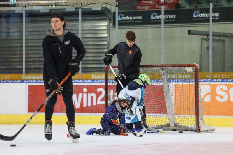 Ein langgehegter Wunsch ging für Kinder aus Linzer Kindergärten in Erfüllung: sie durften bei einem Schnuppertraining in der Linzer Eissporthalle die Profis des Eishockey-Clubs Steinbach Black Wings kennenlernen. Die Kleinen überschütteten ihre Idole mit Fragen und waren dann selbst mit vollem Einsatz auf dem Eis unterwegs. Die Profis führten den Kindern Tricks vor, die dann versuchten ihren Vorbildern nachzueifern.