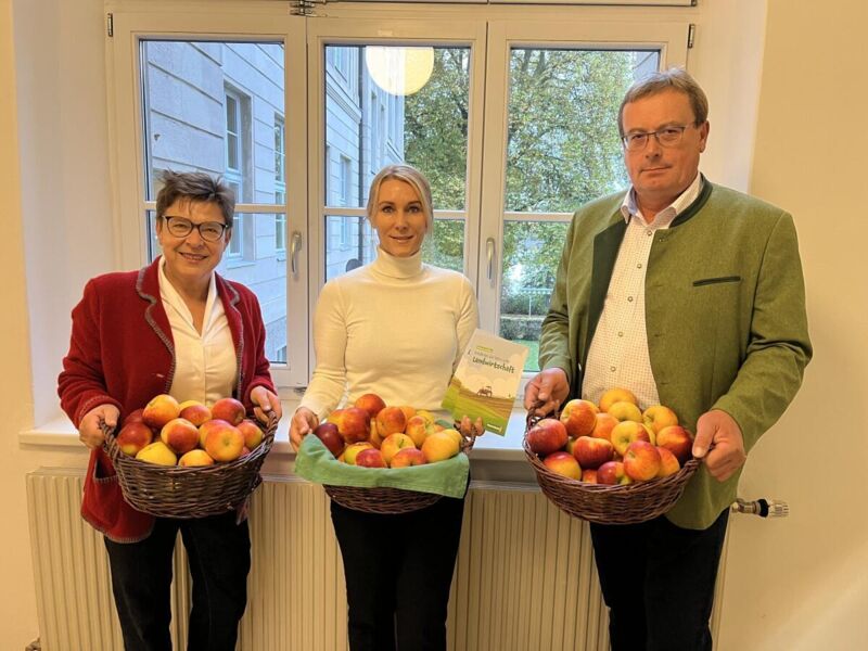 Die Bezirksbäuerin Michaela Sommer besuchte gemeinsam mit Bauernbund-Bezirksobmann Johannes Gruber die VS 6 Römerbergschule. Dabei übergaben sie die Broschüre „Entdecke die heimische Landwirtschaft“ sowie Körbe voller frisch geernteter Äpfel an Schuldirektorin Nicole Staufner.