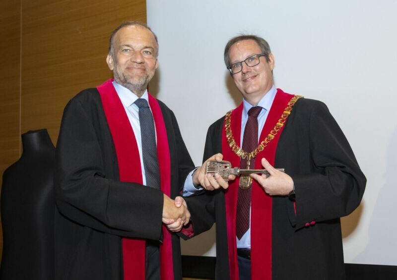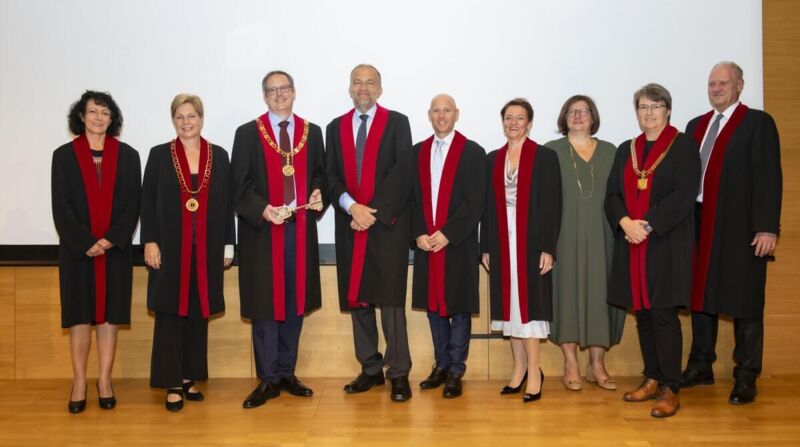 Kette und Schlüssel übergeben: Stefan Koch ist nun offiziell neuer Rektor der Johannes Kepler Universität
