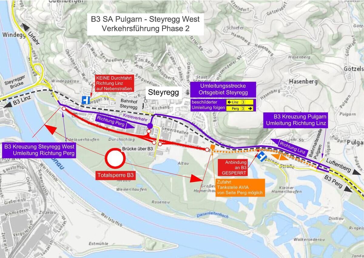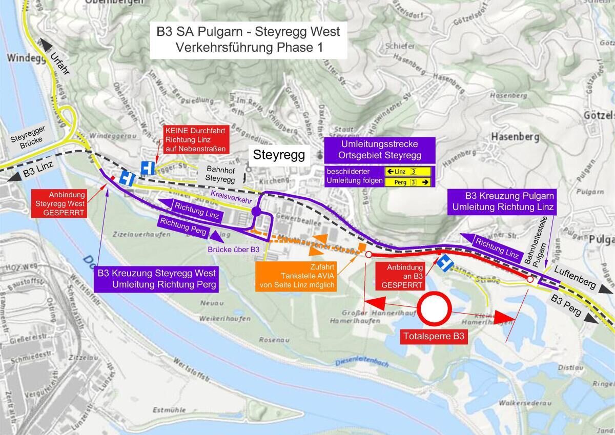 Der Verkehr aus Richtung Perg wird über den Kreuzungsbereich „Pulgarn“ in Richtung L569 Pleschinger Straße abgeleitet und über den Kreisverkehr in Steyregg wieder auf die B3 geführt.