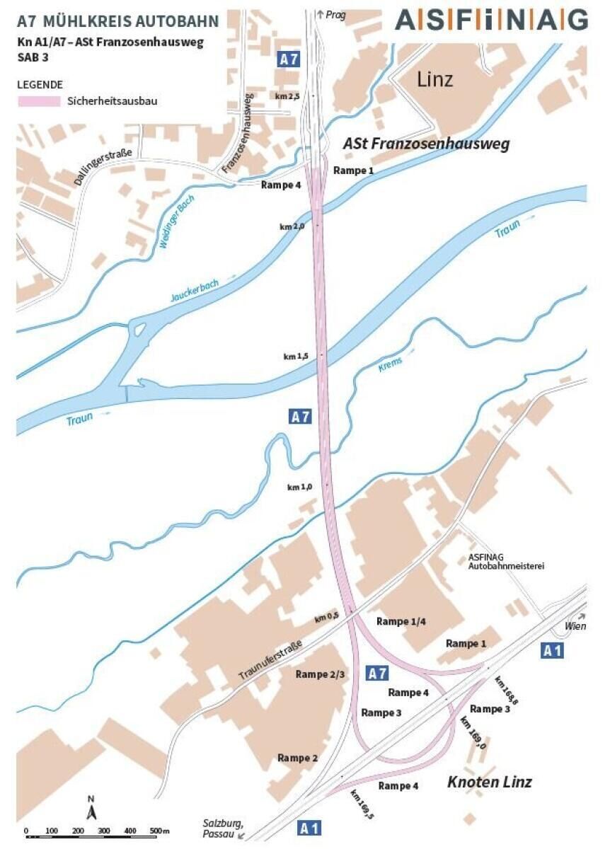 Im ersten Bauabschnitt wird zwischen dem Knoten Linz und der Anschlussstelle Franzosenhausweg die rund zwei Kilometer lange Strecke generalsaniert. In der ersten Phase wird bis zum Sommer auf der Richtungsfahrbahn Freistadt/Prag gearbeitet.