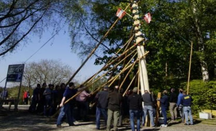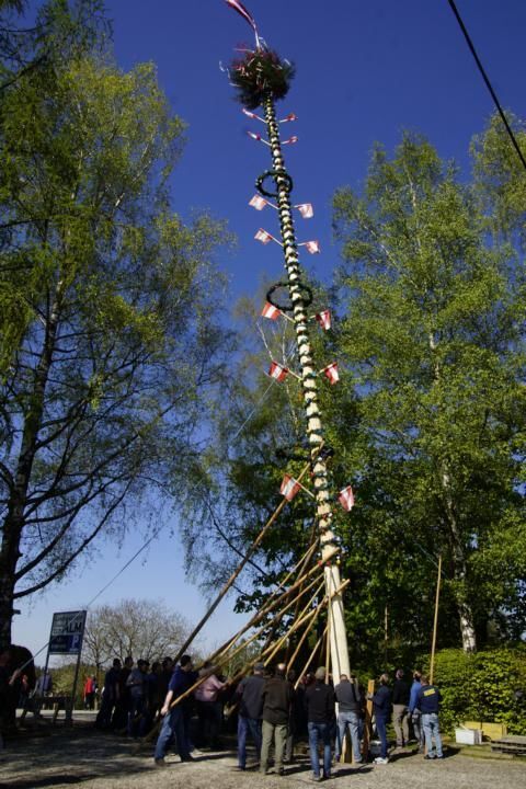 MEHRNBACH. Starke Männer waren beim Maibaumaufstellen der Feuerwehr Oberholz in der Gemeinde Mehrnbach gefragt. Dieser wurde traditionell mit Manneskraft trotz starken Windes neben dem Gasthaus zur Alm aufgestellt.