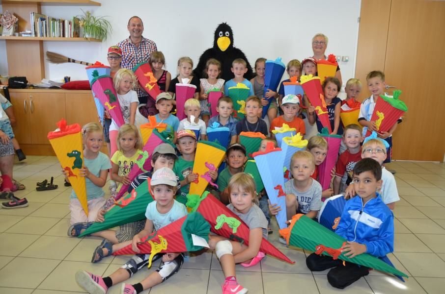 Die ÖVP Frauen mit ihrer Obfrau Vizebürgermeisterin Anneliese Bräuer bastelten die Schultüten und füllten sie mit allerlei Nützlichem und Süßem. Überreicht wurden die von den 32 Kindern heiß ersehnten Schultüten erstmals von Rabe Glück im Lebenshaus Oberneukirchen. Vorher organisierte das EKiZ Wichtelhaus unter der Leitung von Erika Ganglberger eine Überraschungswanderung mit Aufgaben für die Kinder und Eltern. Besonders das gemeinsame Spiel mit dem großen Schwungtuch und der Scheibtruhen-Wettlauf begeisterte die Mädchen und Burschen.