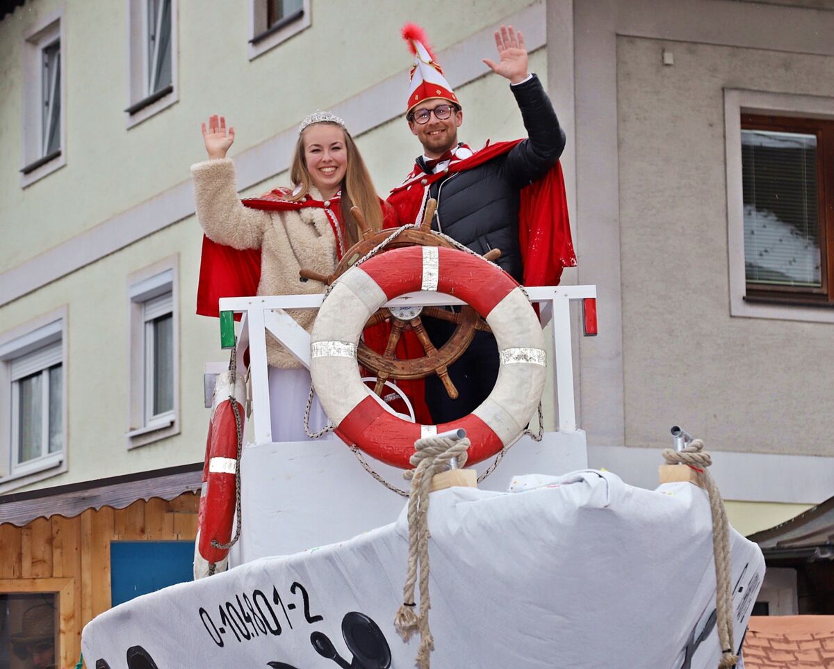 Angeführt von Austrommlern, Gardemädchen und Prinzenpaar zog der bunte Zug zwei Stunden durch den Ort. Vereine griffen aktuelle Themen närrisch auf – von Wassersport bis Quaggermuschel. Tausende Zuseher erlebten eine ausgelassene Lachtherapie und einen Fasching, der weit über die Region hinaus begeisterte.