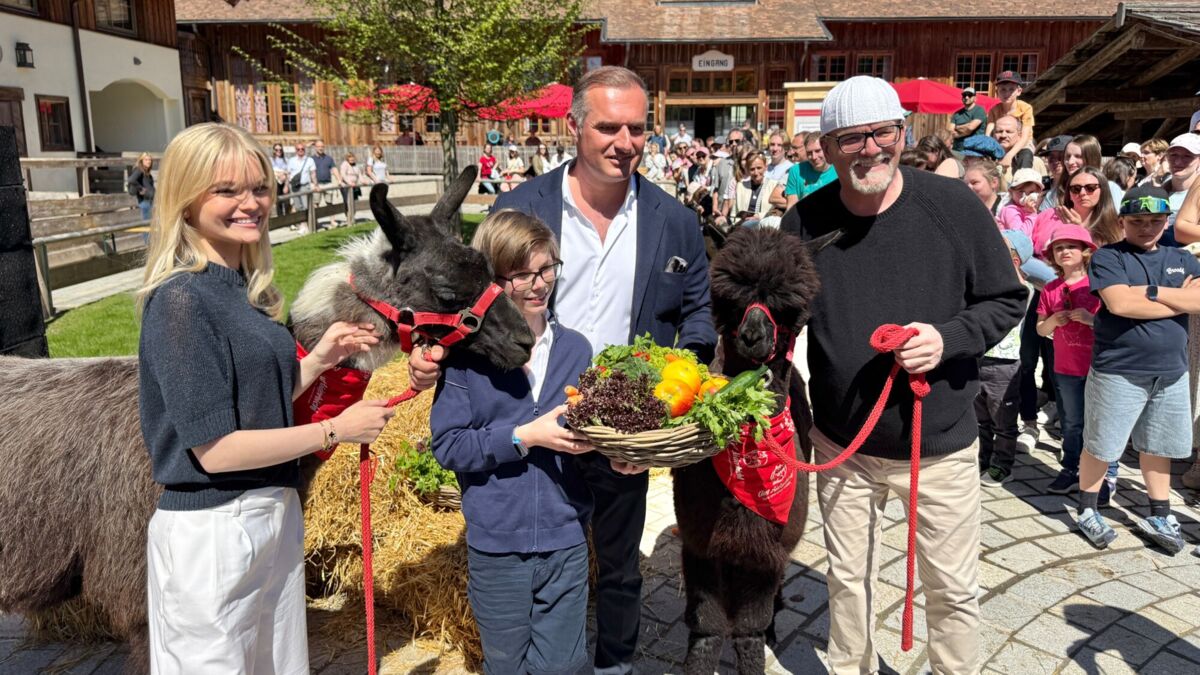 Im Zentrum des Besuches standen zwei neue Schützlinge des Tierschutzhofs: eine gerettete Alpaka-Dame und ein Lama, die auf Gut Aiderbichl ein sicheres Zuhause gefunden haben. Gerry Friedle, besser bekannt als DJ Ötzi, übernahm für beide Tiere die Patenschaft.