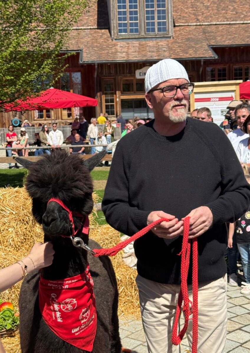 Der Musiker traf pünktlich aus Hamburg ein und startete ohne Verzögerung mit der Taufe der beiden Tiere. Die Zeremonie entwickelte sich rasch zu einem emotionalen Höhepunkt des Tages. Besonders ein schwarzes Alpaka zog dabei alle Blicke auf sich. Mit seinem ruhigen, fast sanften Auftreten wurde es schnell zum heimlichen Star. Auch bei DJ Ötzi war die Verbundenheit zu den Tieren deutlich spürbar.