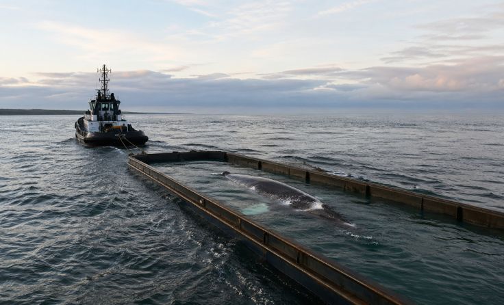 Am Dienstagnachmittag gelang der entscheidende Schritt der Rettungsaktion. Der Wal wurde durch eine zuvor gebaggerte Rinne zu dem abgesenkten Lastkahn geführt und schwamm schließlich in die mit Wasser gefüllte Barge.