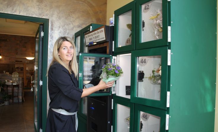 Ein Blumenautomat im Eingangsbereich des Geschäfts hat mehrere Türchen hinter denen sich hübsche Blumensträuße, Blumenstöcke und Deko-Geschenke befinden. Firmenchefin Catrin Polzinger hatte die Idee dazu und sich den Blumenautomat eigens bauen lassen – „eine Spezialanfertigung, denn einen Automat dieser Art gibt es in Österreich bisher nicht“, erzählt die leidenschaftliche Floristin.