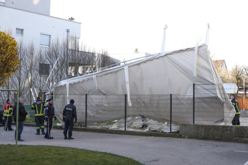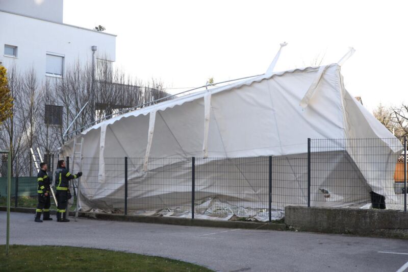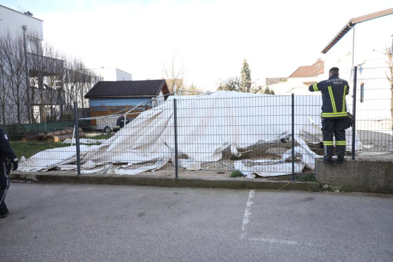 In Wels-Lichtenegg führte ein verwehtes Partyzelt zu einem Einsatz der Feuerwehr, es wurde in einen benachbarten Innenhof geblasen und beschädigte dort zwei parkende Autos.