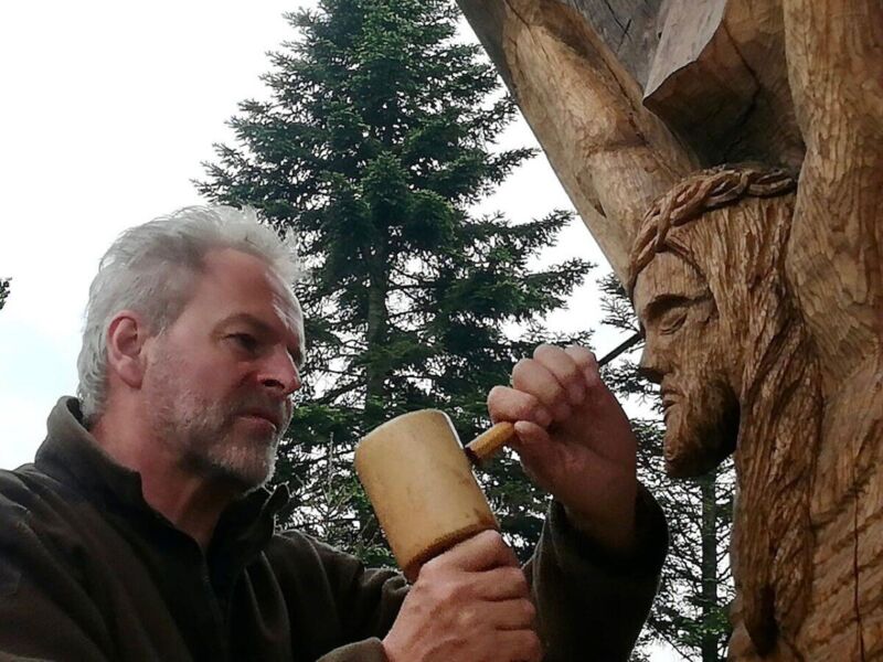 „Da sich bereits beim Schälen des Baumes, eine hervorragende Struktur des Holzes zeigte, hielt ich mit den Franziskanerinnen noch einmal Rücksprache, denn daraus musste etwas Besonderes entstehen. Und so konnte ich dann meiner Fantasie freien Lauf lassen“, so Untersperger. Das ganze Jahr hat der Hobby-Bildhauer dann fleißig neben seinem eigentlichen Vollzeit-Job am Gedenk-Marterl gearbeitet und seine Ideen und Inspirationen einfließen lassen. „Für mich ist es eigentlich nicht recht schwer so etwas zu schnitzen, man muss einfach nur das wegklopfen, was weggehört“, schmunzelt der Steinbacher, der sein Talent bereits als kleiner Bub entdeckte.
