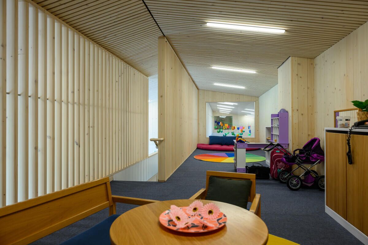 Das Gebäude wurde nach einem architektonischen Ideenwettbewerb in nachhaltiger Holzbauweise errichtet und mit Geothermie sowie Photovoltaik ausgestattet. Auch beim Außenbereich wurde ein Fachplaner herangezogen und der Spielplatz wurde an die Bedürfnisse der Kinder angepasst.