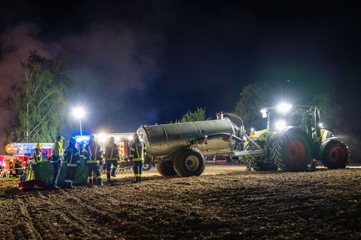 Zusätzlich unterstützen umliegende Landwirte die Einsatzkräfte, indem sie mit Vakuumfässern Löschwasser zur Einsatzstelle transportieren.