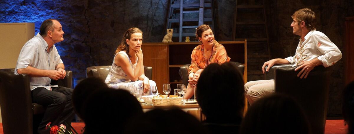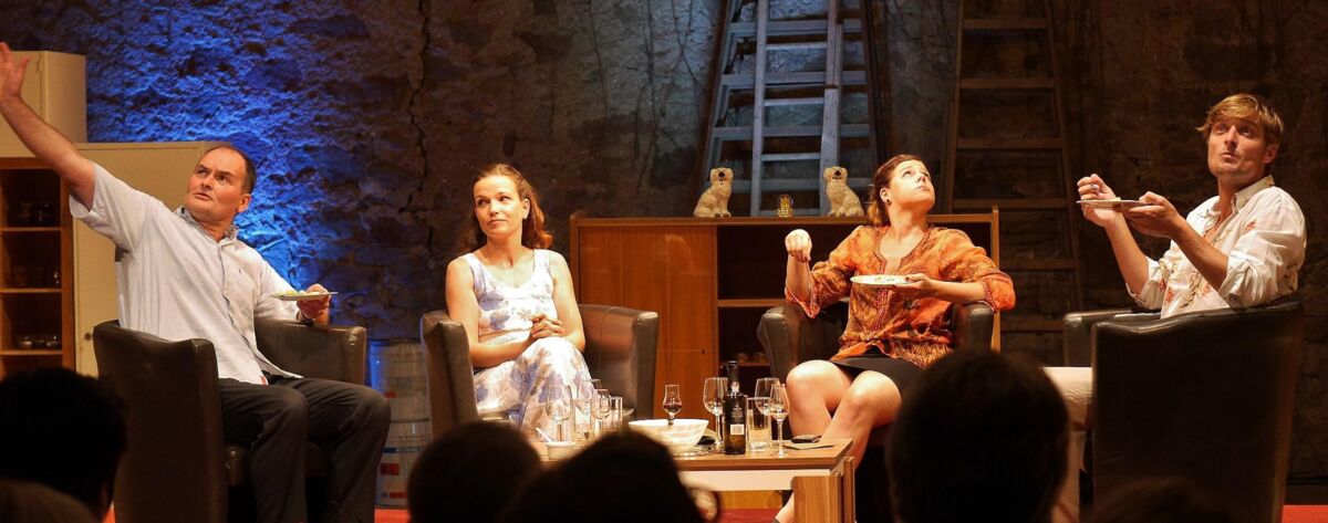 Ein Pärchen besucht das andere und dann gerät irgendwie alles aus den Fugen. Ribbeck und Woy mit ihrem fast anstrengenden Geturtel, Julia Frisch als Deilings Freundin, die schon ein wenig „seltsam“ ist und damit den Anstoß für allerhand Vermutungen gibt. Dreiling als Christoph will die anrollende Lawine aufhalten und ... scheitert dabei aber auf ganzer Linie. Mehr muss man nicht verraten. Das Stück ist komisch vom Anfang bis zum Schluss. Eine großartige schauspielerische Leistung von allen Protagonisten. Regisseur Uwe Lohr hat wieder etwas gefunden, das ideal passt, sowohl zu den Darstellern als auch zum Umfeld.