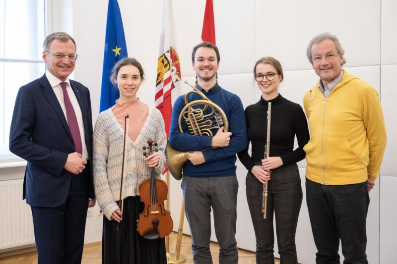 Franz Welser-Möst war gemeinsam mit den drei Orchestermitgliedern Klara Brunnhofer, Lea Zach und Maximilian Kerschbaummayr zu Gast bei Landeshauptmann Mag. Thomas Stelzer, um über die Konzertreihe zu sprechen.