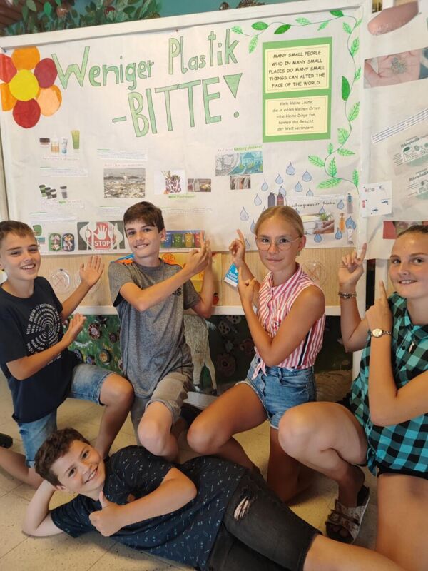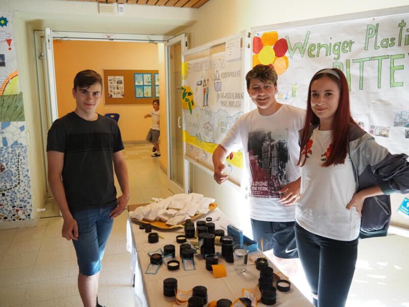 Während die Schüler der 3a Klasse der MS Naarn den Hauptpreis bei der „Müllchallenge“ gewonnen haben und somit eine Bahnfahrt nach Wien, inklusive Führung in der Hofburg und Besuch beim Bundespräsidenten, hieß es in der Parallelklasse 3b „Weniger Plastik, bitte“: In verschiedensten Unterrichtsfächern beschäftigten sich die Jugendlichen mit Plastikmüll, der Bedeutung von Kunststoff im Alltag, Mikroplastik im Boden, in den Gewässern und in der Nahrung. Um selbst Müll zu vermeiden, stellten sie Naturkosmetikprodukte her und verkauften diese sehr erfolgreich beim Elternsprechtag.
