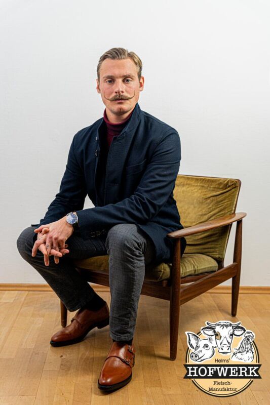 Auf der gehobenen Gastronomie sei eigentlich von Beginn an der Hauptfokus seiner Fleischmanufaktur gelegen, erklärt Helm. Der gebürtige Puckinger mit dem markanten Zwirbelbart, der sich selbst als „exzentrischen Typen“ bezeichnet, hatte bewusst sein gesamtes persönliches Auftreten auf diese Branche hin zugeschnitten: „Das Hofwerk ist eine Marke und ich als Chef und Aushängeschild bin ein wichtiger Teil dieser Marke“, sagt er selbstbewusst.