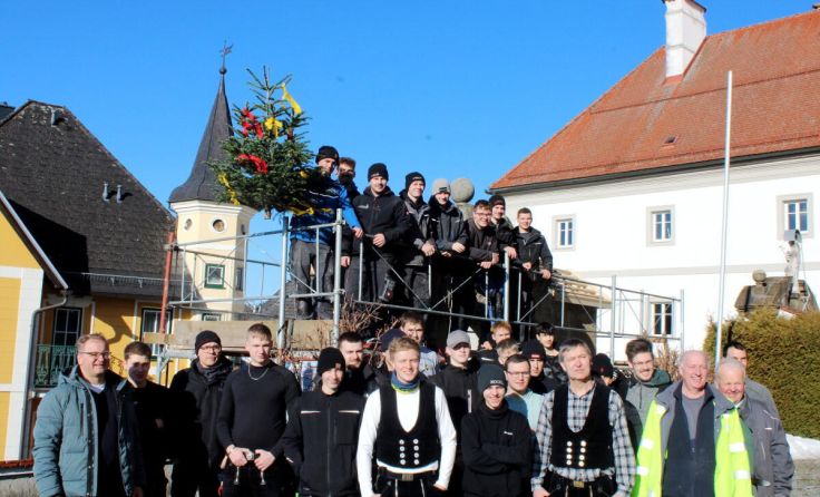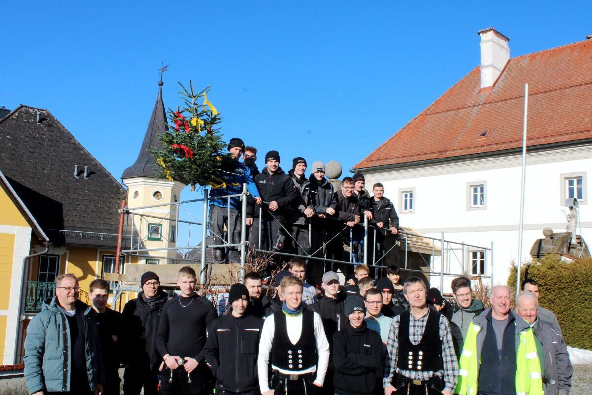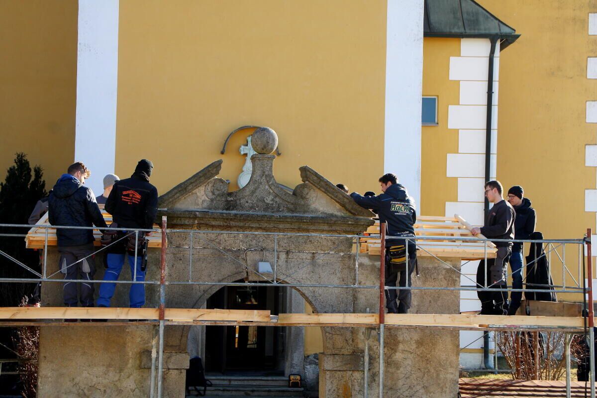 MÜNZBACH. Ende Jänner errichteten 18 Zimmerer-Lehrlinge aus Deutschland (1. Lehrjahr) gemeinsam mit sieben Zimmerer-Lehrlingen aus Oberösterreich (3. Lehrjahr) im Rahmen eines Schulprojekts eine neue Holz-Unterkonstruktion in Form eines Dachstuhl über dem Stiegenaufgang beim Eingangsportal der Pfarrkirche Münzbach.