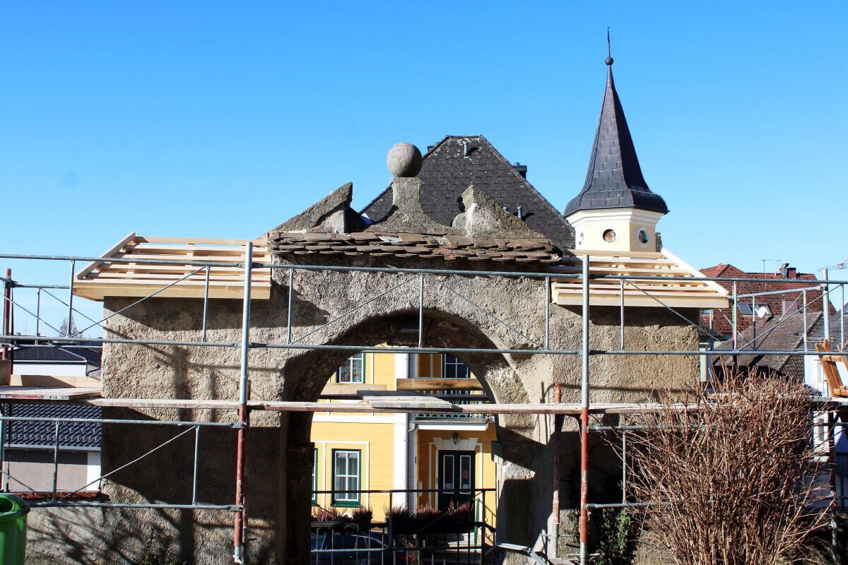 Dieser Bau ersetzt die zuvor morsche Holz-Unterkonstruktion, die so beschädigt war, dass Ziegel herunterfallen konnten. Eine Sanierung war daher dringend erforderlich. Um die Vorbereitung und die Planung des Projekts kümmerte sich Johannes Lindtner, Lehrer an der Berufsschule Linz. Die Lehrlinge setzten seine Planung handwerklich um und errichteten die neue Konstruktion als praktischen Teil ihrer Ausbildung.