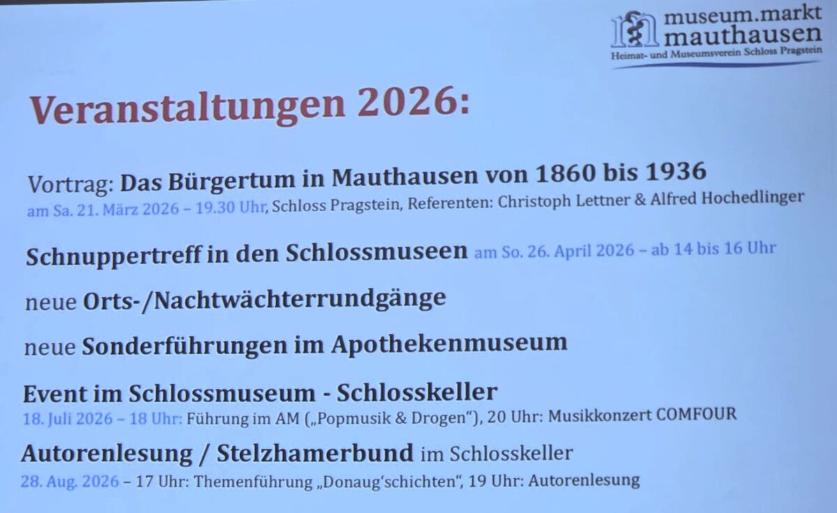 Im offiziellen Teil berichtete Obmann Konsulent Karl-Heinz Sigl über die Vereinsarbeit der Jahre 2022 bis 2025. Ergänzend informierten die Museumsleiter Hubert Voigt und Josef Wintersberger über die Entwicklung in Apothekenmuseum und Heimatmuseum. Der Obmann bedankte sich beim Team und bei den Kooperationspartnern. Besonders hervorgehoben wurde Mauthausen Tourismus als zentraler Partner.