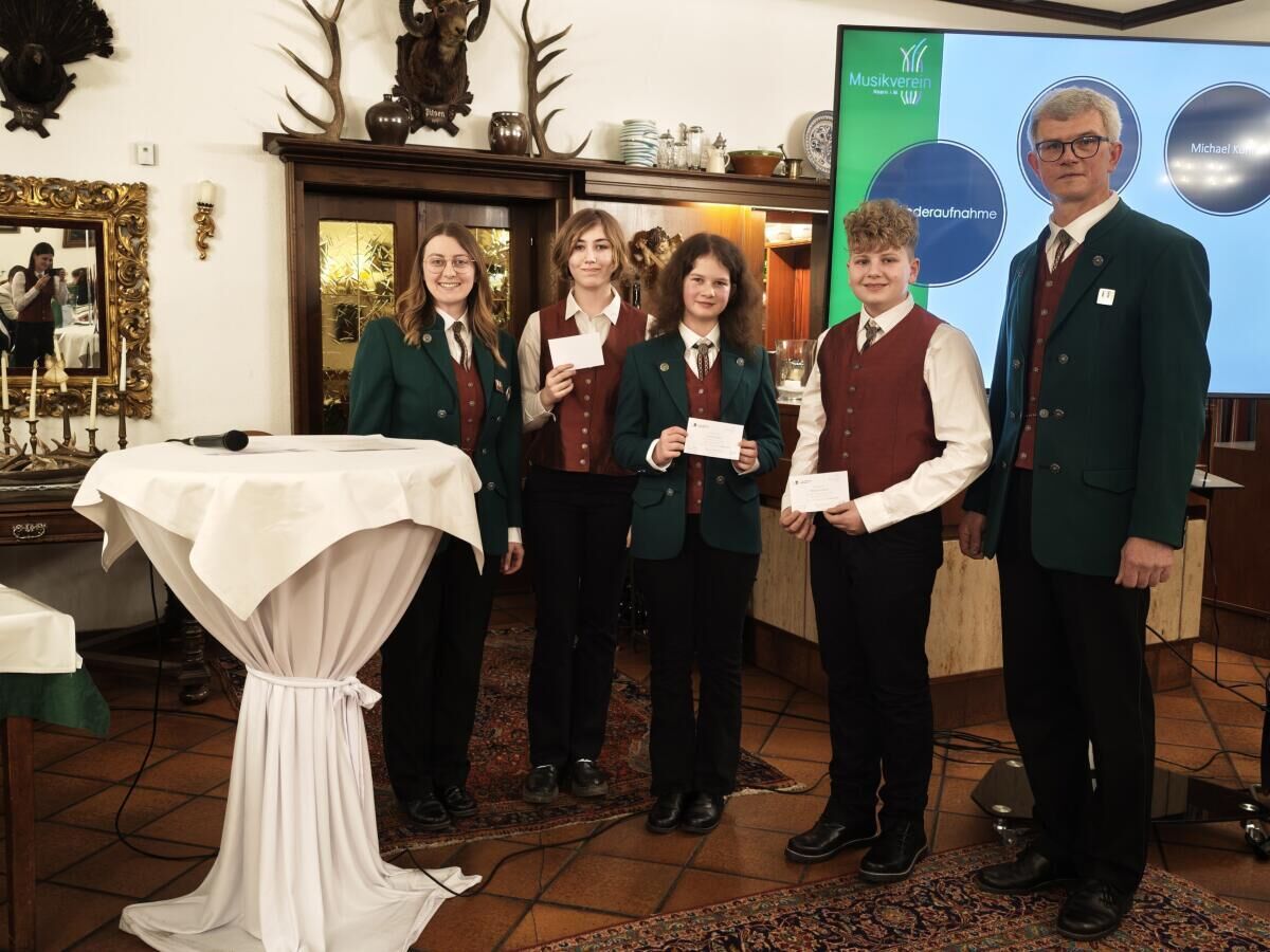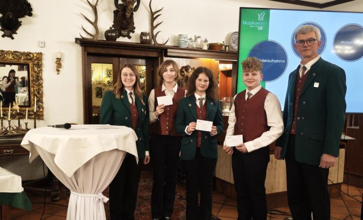 Julian Lettner wurde für sein Junior-Leistungsabzeichen auf dem Schlagwerk geehrt. Das Jungmusiker-Leistungsabzeichen in Bronze erhielten Johanna Hölzl auf der Posaune, Sarah Pflügler auf der Querflöte sowie Pauline Tüchler auf der Tuba. Besonders erfreulich ist, dass mit Johanna Hölzl, Pauline Tüchler und Michael Kühhas (Trompete) drei neue Mitglieder offiziell in den Verein aufgenommen werden konnten.