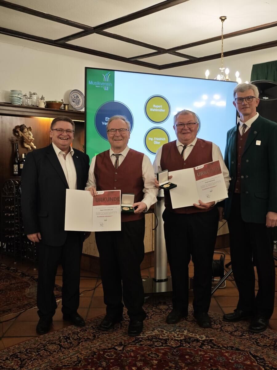 Obmann Georg Hölzl nahm zudem zahlreiche Ehrungen für langjährige Verdienste vor. Alexandra Brabenetz wurde mit der Verdienstmedaille in Bronze ausgezeichnet. Die Verdienstmedaille in Gold ging an Gerlinde Buchner und Michaela Schmidtberger, wobei Gerlinde Buchner zusätzlich das Ehrenzeichen in Silber erhielt. Das Ehrenzeichen in Gold wurde Franz Weichselbaumer verliehen. Für ihr jahrzehntelanges Engagement und ihre besonderen Verdienste im Verein wurden Ehrenobmann Rupert Wahlmüller (Klarinette) und Rudolf Emhofer (Tuba) mit dem Verdienstorden in Gold ausgezeichnet. Ehrenkapellmeister Friedrich Öller (Klarinette) erhielt den Verdienstorden in Silber.