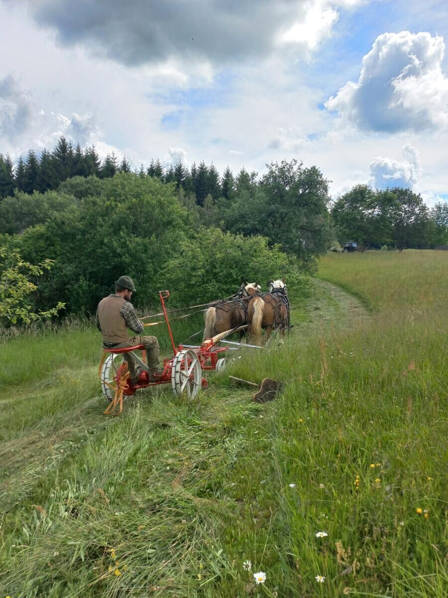 Warum das Pferd als Arbeitskraft auf dem Allmerhof so gut funktioniert? „Pferde können ihre Arbeit richtig genießen und nehmen sie auch dankbar an“, erklärt Hofherr Benjamin, der nebenbei auch als Hufschmied tätig ist. „Pferde wollen nicht den ganzen Tag stehen. Man merkt deutlich, wie sehr sie sich jetzt auf das Frühjahr freuen. Sie sind stolz auf ihre Arbeit und möchten uns auch zufriedenstellen.“ Eine Schattenseite dieser traditionellen Bewirtschaftung, wie sie die Allmers ähnlich den Bauern vor 100 Jahren praktizieren: „Natürlich brauchen wir viel länger für unsere Arbeiten“, erzählt Jacqueline. „An einem Tag mähen wir etwa einen halben Hektar – andere Bauern schaffen in derselben Zeit fünf Hektar.“ Diese Zeit nehmen sich die Allmers jedoch bewusst und gerne.