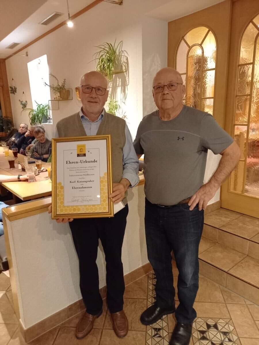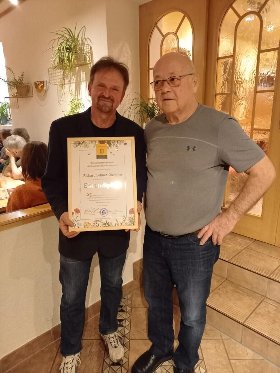 Ein besonders schöner Moment war es, als der Imkerverein zwei seiner insgesamt 30 Mitglieder ehren durfte. Gesundheitswart Richard Lehner-Ölweiner bekam für 25 Jahre Vereinsmitgliedschaft eine Urkunde und Anstecknadel. Karl Katzengruber wurde für seine ehemalige Zeit als Obmann und seine nach wie vor aktive Förderung und Unterstützung für den Verein zum Ehrenobmann ernannt.