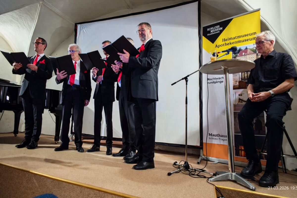 Im Zentrum des Abends standen die beiden Erzähler und Gestalter Christoph Lettner und Alfred Hochedlinger. Sie führten das Publikum mit hoher fachlicher Tiefe und spürbarer persönlicher Verbundenheit durch die Geschichte Mauthausens. Lettner überzeugte mit fundierter historischer Recherche, Originalquellen und erzählerischer Klarheit. Hochedlinger ergänzte diese Ebene mit musikalischem Gespür und kultureller Einordnung. Genau diese Kombination machte den Abend stark. Kein trockener Vortrag, sondern ein lebendiges Gesamtbild.