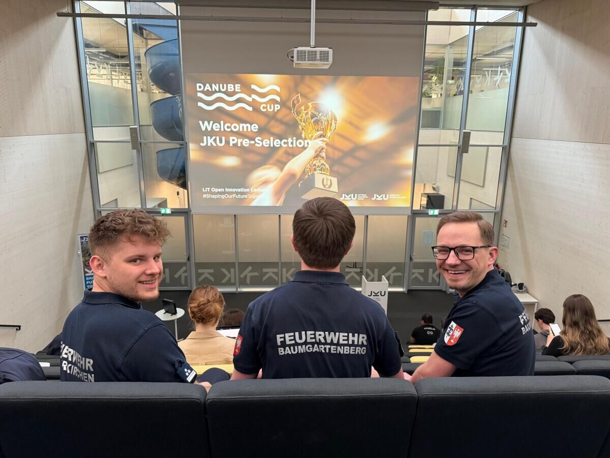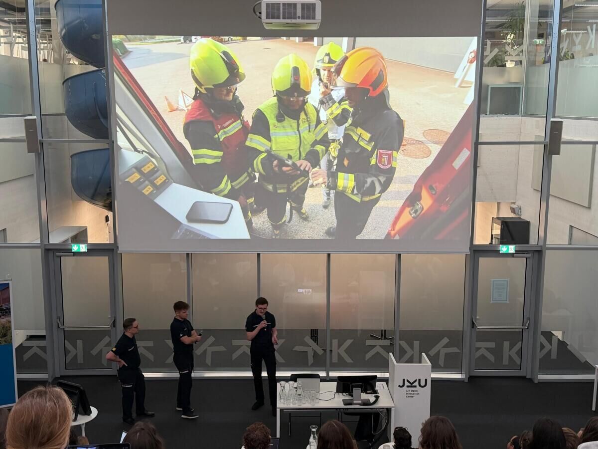 BEZIRK PERG. Die Feuerwehr-Mitglieder Michael Riegler, Philipp Neuhauser und Alexander Wallner präsentierten ihre Einsatz- und Lageführungssoftware FireOPS im Open Innovation Center der Johannes Kepler Universität (JKU) in Linz in einem vierminütigen Pitch auf Englisch vor Publikum und Jury, gefolgt von einer ebenso intensiven Frage-und-Antwort-Runde.