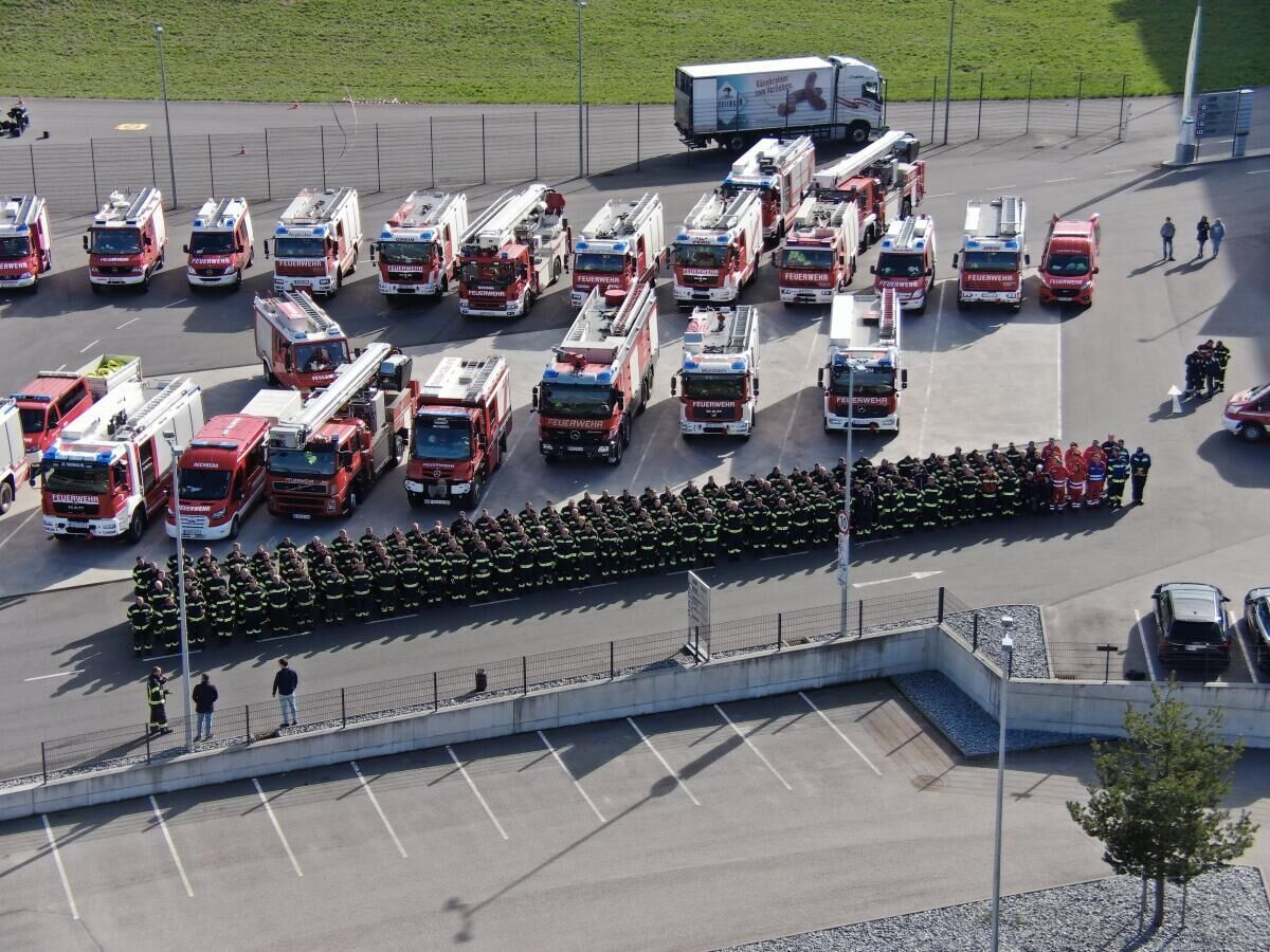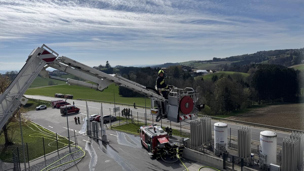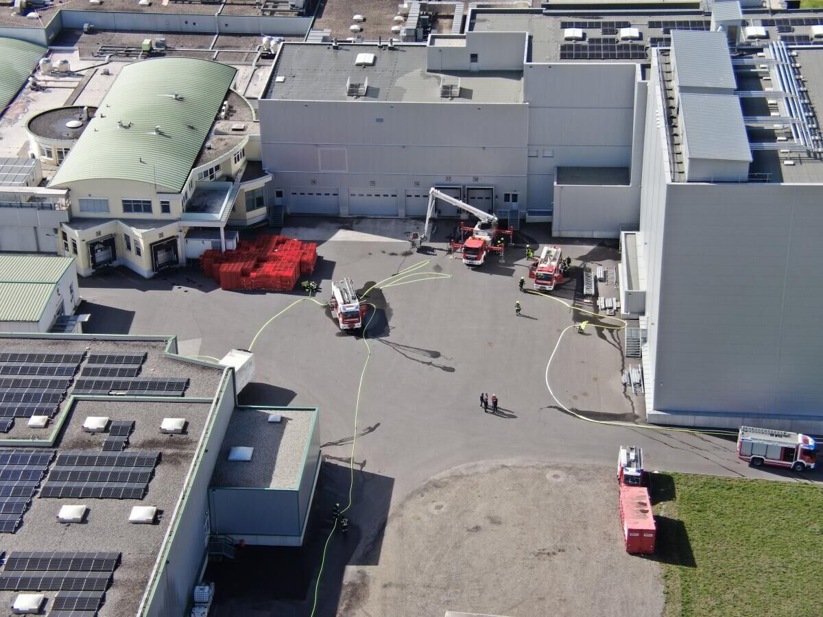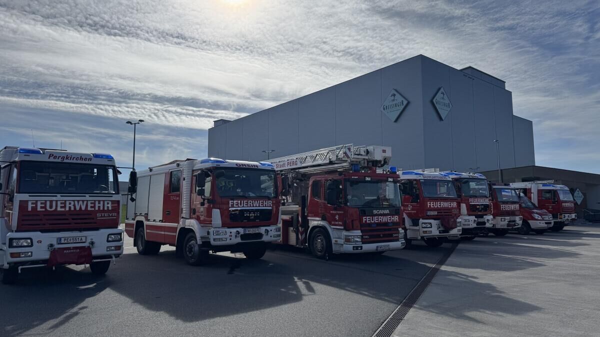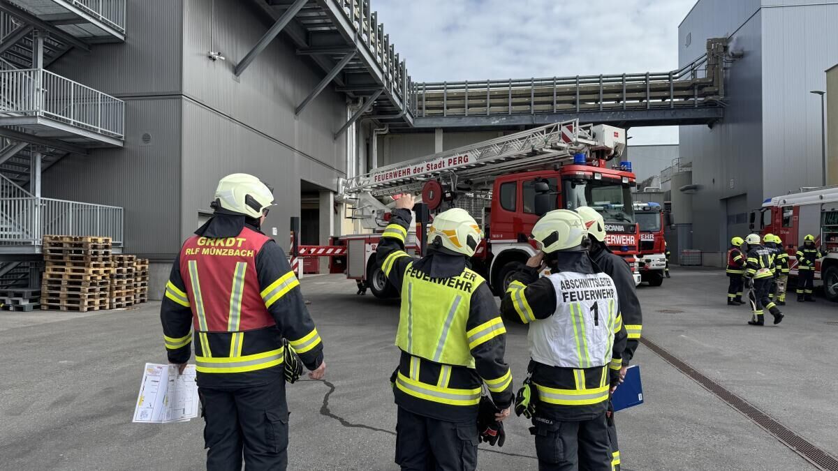 MÜNZBACH. Bei der Firma Greisinger in Münzbach fand eine groß angelegte Alarmstufe-drei-Übung statt. Insgesamt nahmen 18 Feuerwehren mit 27 Einsatzfahrzeugen sowie die Einsatzführungsunterstützung daran teil. Zusätzlich standen zwei Fahrzeuge des Roten Kreuzes Perg mit Besatzung im Übungseinsatz. Auch die Drohne der Feuerwehr Haid unterstützte die Einsatzleitung bei der Lageerkundung aus der Luft.