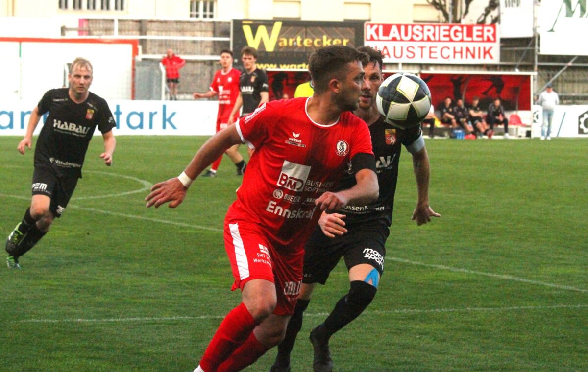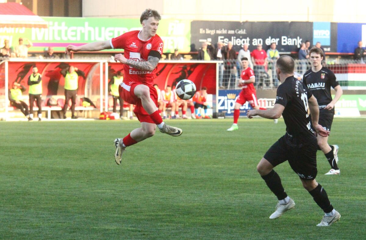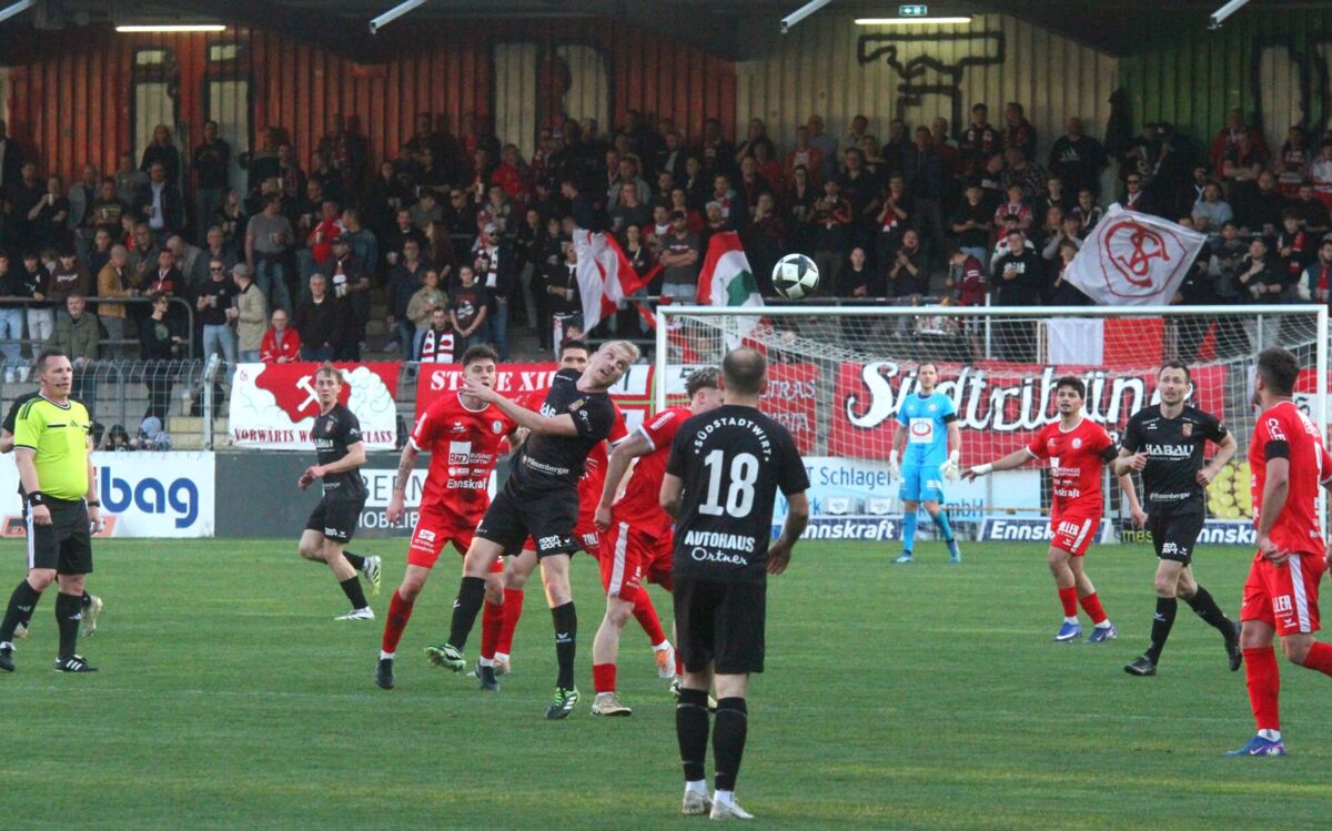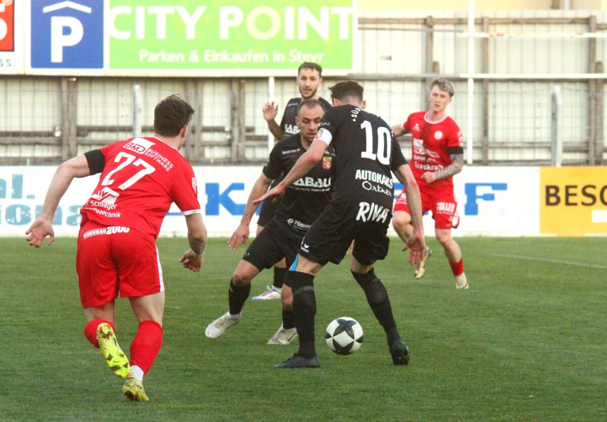 PERG. Am 18. April 2026 holt das Team von Jürgen Prandstätter beim Gastgeber im Vorwärts Stadion vor rund 1300 Fans ein 1:1-Unentschieden. Die HABAU-Elf spielt von Beginn weg ambitioniert und ist auch über weite Strecken besser als Steyr. Die Tore fallen jeweils vom Elfmeterpunkt. Nach Foul an Mario Ebenhofer trifft der noch vor der Pause zum verdienten Ausgleich. Perg teilt damit zum fünften Mal in Serie die Punkte.
