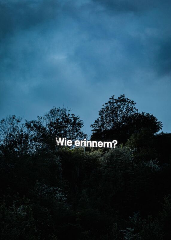 ST. GEORGEN AN DER GUSEN/LINZ. Anlässlich der Befreiungsfeiern 2020 leuchtete der Schriftzug „Wie erinnern?“ am Hang oberhalb der Stollenanlage St. Georgen/Gusen. Absolventen der Kunstuni Linz erinnerten mit diesem künstlerischen Gedenkprojekt an die dortige Zwangsarbeit unter unmenschlichen Bedingungen.