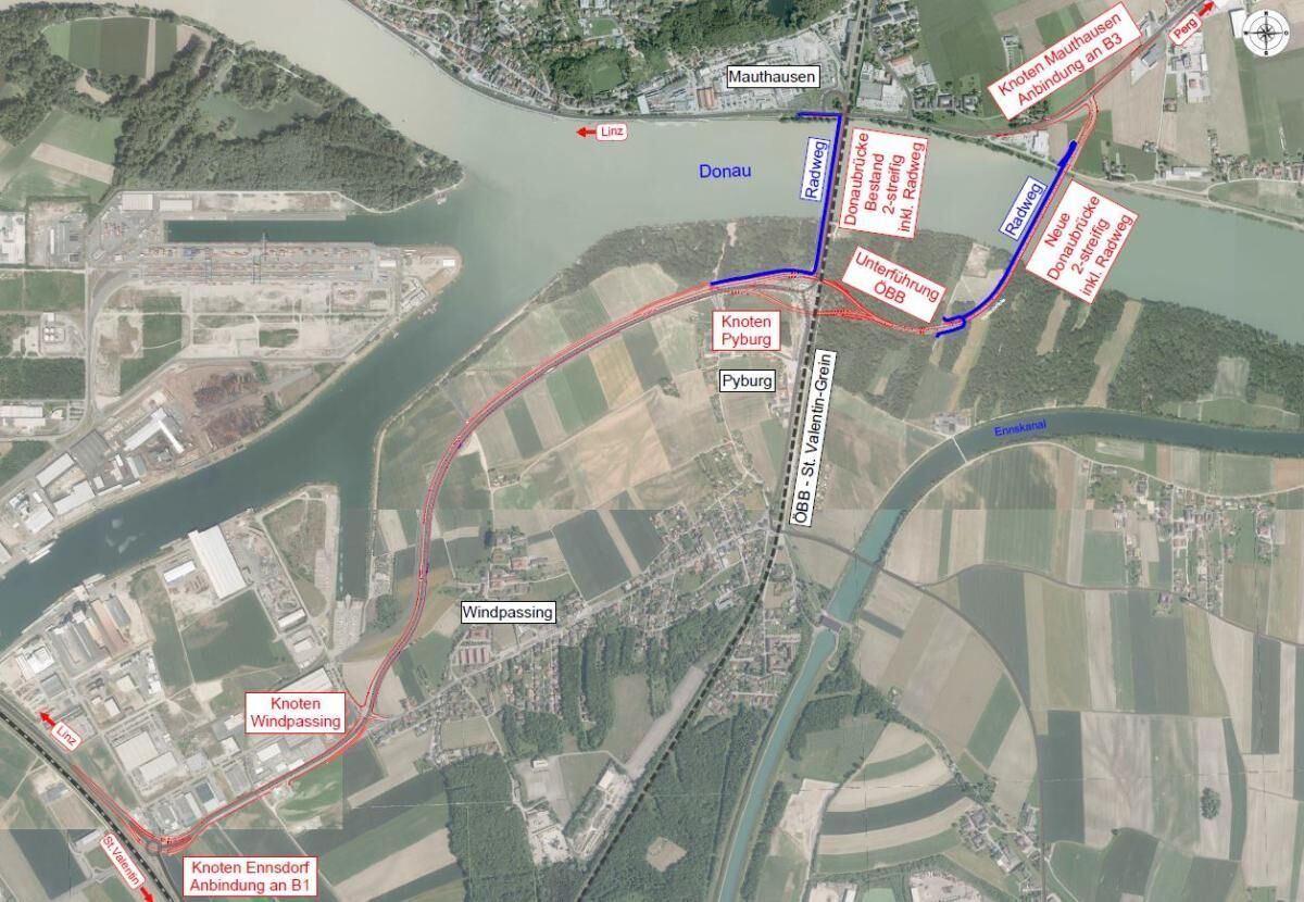 Der Anschluss der neuen Donaubrücke soll über eine Verbreiterung der Umfahrung Pyburg-Windpassing im Westen erfolgen, nachdem sich Anschlussmöglichkeiten in Richtung Osten – auch aus verkehrlichen Gründen – als nicht umsetzbar erwiesen haben. Zusätzlich wird auf der neuen Donaubrücke ein Radweg errichtet, um eine adäquate Radwegverbindung zwischen den beiden Bundesländern zu ermöglichen. Die geschätzten Gesamtkosten einschließlich einer Sanierung der bestehenden Donaubrücke Mauthausen betragen 137 Millionen Euro und werden zwischen den Bundesländern Ober- und Niederösterreich im Verhältnis 55 zu 45 Prozent aufgeteilt. Der Verkehr, der bis 2035 auf rund 29.000 Fahrzeuge pro Tag anwachsen soll, wird sich entsprechend der Berechnungen je zur Hälfte auf die neue und die bestehende Brücke aufteilen.