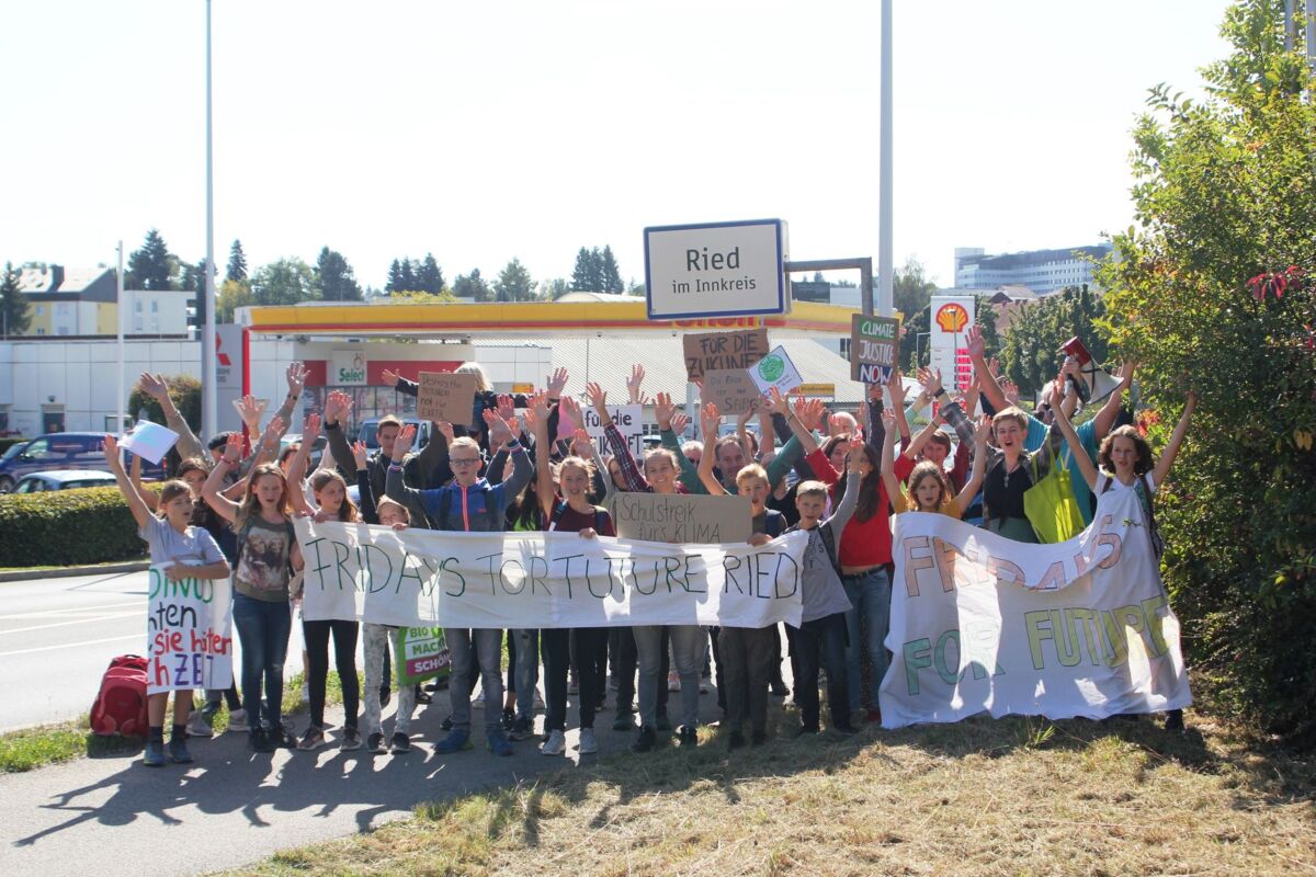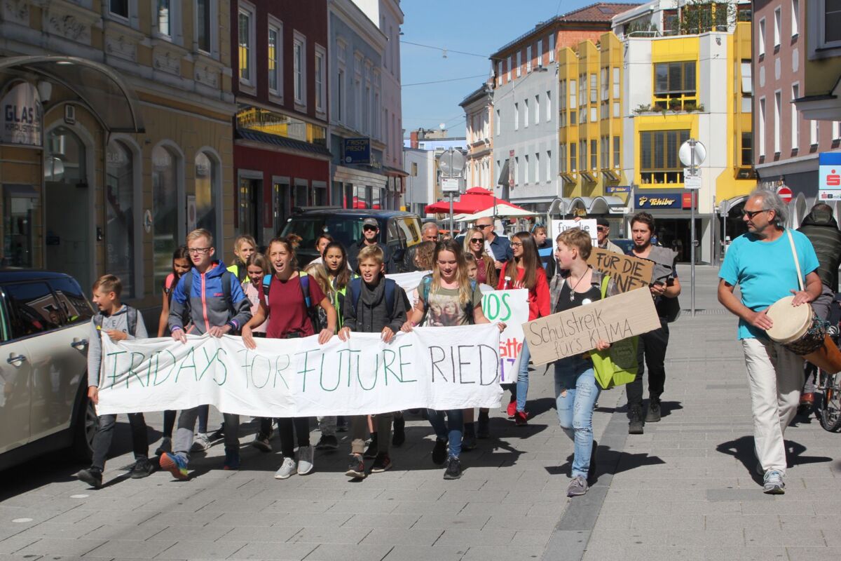 Zur „Fridays for Future“-Demo in Ried trafen sich etwa 40 Teilnehmerinnen und Teilnehmer um fünf vor zwölf am Hauptplatz und marschierten durch die Innenstadt und dann die Riedauer Straße stadtauswärts, um schließlich am Ortsschild bei Hannesgrub die Abschlussfotos der Aktion „Dein Ort für die Zukunft“ - „Ried für die Zukunft“ zu machen.