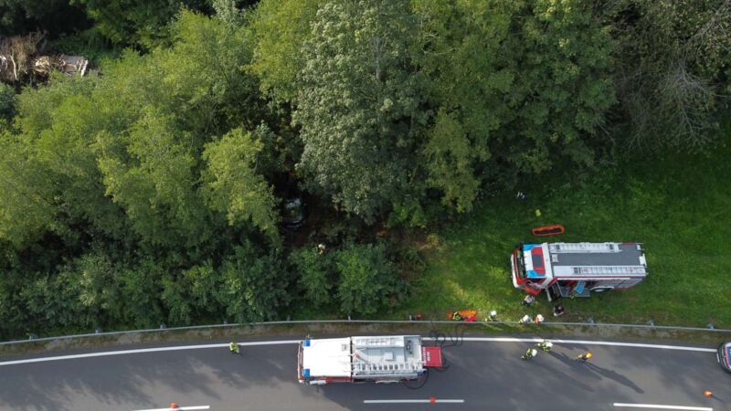 Das verunfallte Fahrzeug konnte dann von den Einsatzkräften entdeckt werden. Die Lenkerin war zum Glück nicht eingeklemmt, sie überstand den Unfall offenbar leicht verletzt. Nach der Erstversorgung durch Rettungsdienst und Notarzt wurde sie ins Krankenhaus gebracht. Die Feuerwehr barg den Unfallwagen.
