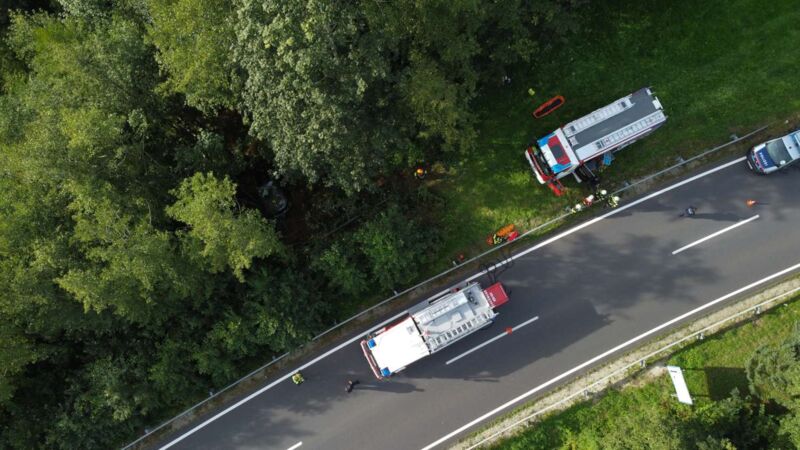 Die Feuerwehr wurde zu einem Verkehrsunfall mit eingeklemmter Person alarmiert. Eine Autolenkerin hat aus bisher unbekannten Gründen die Kontrolle über ihr Fahrzeug verloren, fuhr über eine Wiese und stürzte über eine steile Waldböschung in ein Waldstück, wo der Wagen zum Stillstand kam. Die Lenkerin konnte anfangs keine genauen Angaben zum Unfallort machen, daher wurden nach einer ersten ergebnislosen Suche weitere Kräfte alarmiert.